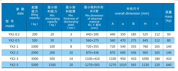 Series YX2 is made of ferrite adopting ratchet wheel and pallet mechanism together with the raise of traveling crane to control the mandril and automatically absorb and unload the materials, featuring no electricity consumption, convenient and safe in operation.lt is widely used for lifting and transporting short and thick plates at factory, dock, warehouse and transportation department. The air gas adjusting rod is equipped in particular which can adjust the magnetic force conveniently. Its working face still remain magnetism, during unloading process.